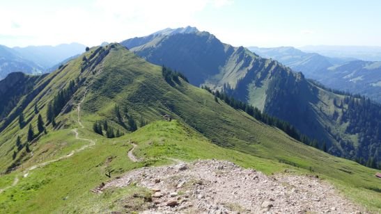Der Sedererstuiben bietet von seinem Gipfel einen guten Rundumblick auf die Gipfel der Nagelfluhkette. In Richtung Osten auf seinen Nachbarsgipfel Stuiben und Sonthofen sowie nach Südosten und Süden auf die Gipfel der Allgäuer Hochalpen.