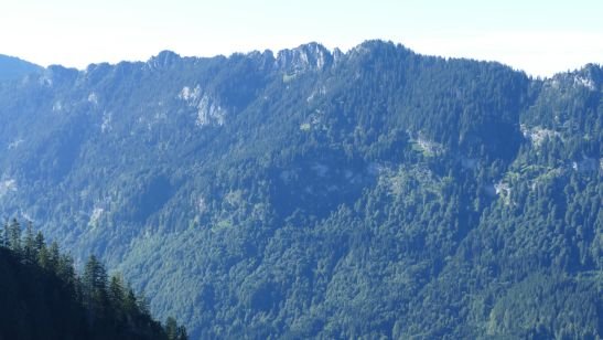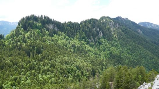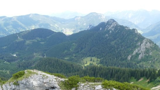 Der Sonnenberg bietet von seinem Grat aus einige Tiefblicke in das Graswangtal, auf die Notkarspitze sowie auf die benachbarten Gipfel der Ammergaur Alpen.