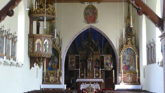 Das Innere zeigt ein einheitliche neugotische Ausstattung aus dem Jahr 1898; die Altäre stammen von Josef Anton Müller.