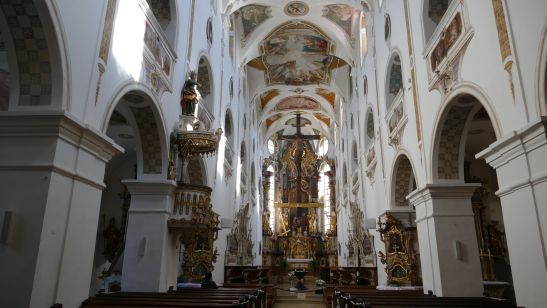 Die Kirche iste eine querhauslose, pilastergegliederte Pfeilerbasilika zu acht Jochen mit drei kreuzgratgewölbten, dreiseitig geschlossenen Schiffen.