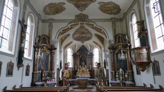 Die Altäre wurde um 1781 in späten Rokokoformen errichtet, die Altargemälde stammen von Franz Xaver Stehle: am Hochaltar: "hl. Leonhard als Fürbitter der Notleidenden", 1783; linker Seitenaltar: "Schutzengel", 1784.