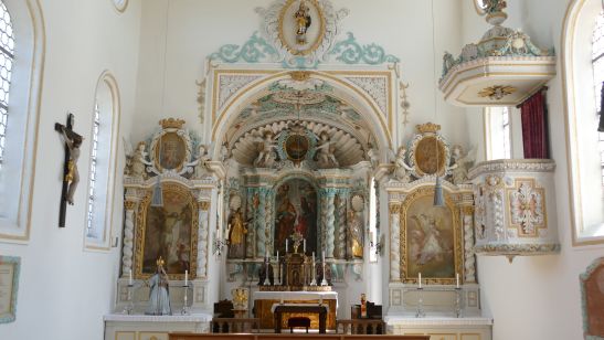 Die Kanzel sowie die drei Altäre sind stuckiert, sie haben gedrehte Säulen.